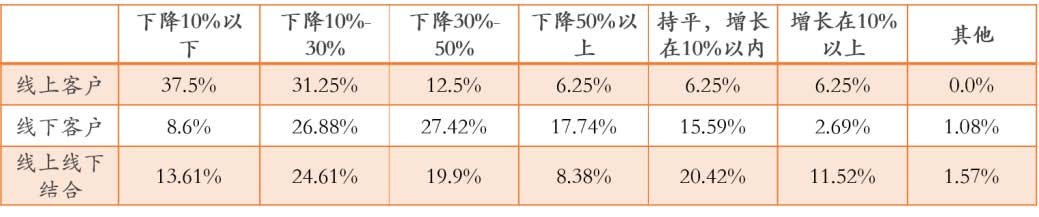 ? ? ??疫情對于以線上或線下客戶作為服務對象的文化企業來說,差異明顯。以服務線上用戶為主的文化企業認為明年業績下降百分之十以內的占到37.5,下降10%-30%的占比31.25%,下降30%-50%的占12.5%,而認為業績持平或增長的文化企業都占到6.25%;而以服務線下客戶為主的文化企業認為業績下降10%-30%的占26.88%,下降30%-50%的占27.42%,下降50%以上的占17.74%;線下線下結合服務客戶的文化企業相對來說受影響也比純服務線下客戶的文化企業較小,持平或增長的文化企業占比超過30%,下降10%以下的文化企業占13.61%,下降10%-30%的文化企業占比為24.61%,下降30%-50%的文化企業占比為19.9%。