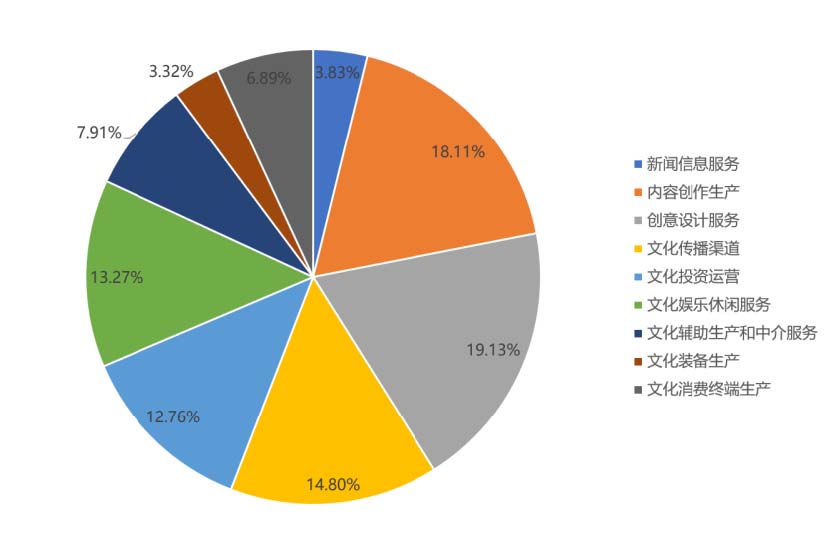 ? ? ??從業態來看,文化企業的業態分布較為均衡,內容創作生產、創意設計服務、文化傳播渠道、文化投資運營、文化娛樂休閑服務類文化企業占比都超過10%。