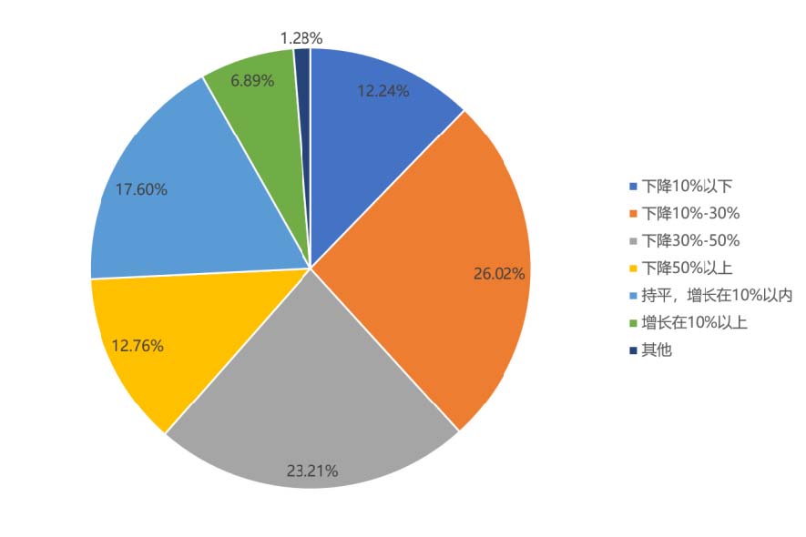 ? ? ??約74%的文化企業預測今年的經營業績同比呈下降趨勢,其中認為下降將超過10%以上的超過百分之六十(其中有12.76%文化企業認為業績下降將超過50%),另外有17.6%文化企業可以持平,6.89%文化企業認為增長在10%以上。總的來看,影響面大,產生了一定程度的悲觀心態。