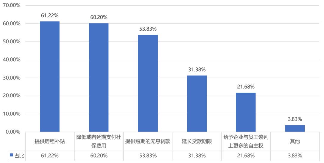 ? ? ??有61.22%文化企業希望提供租房補貼,有60.20%文化企業希望降低或者延期支付社保費用,有53.38%文化企業希望提供短期的無息貸款,有31.38%文化企業希望延緩貸款期限,有21.68%文化企業希望給予與員工談判上更多的自主權。各類文化企業為當前我國經濟發展的主體,政府和社會能從多大程度上給予幫助渡過難關,將顯得至關重要。