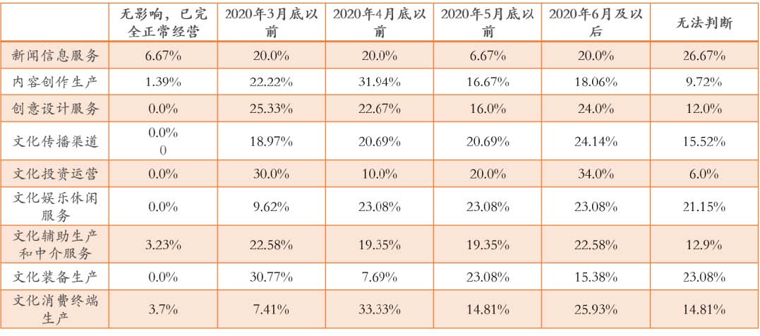 ? ? ??約79%的文化企業認為2020年3月底以前文化企業都不能恢復到正常營業狀態;大約60%的文化企業認為在6月份之前可以正常恢復生產經營;23.72%的文化企業認為要在6月以后才能恢復。對于大多數文化企業來說,由于有幾個月時間不能正常營業,2020年將會是非常艱難的一年。