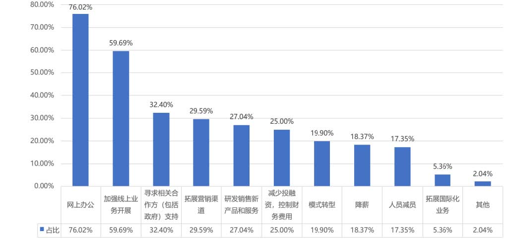 ? ? ??76.02%文化企業采取線上辦公,59.69%加強線上業務拓展的方式。外部環境的變化,帶來了組織行為的轉變,既是挑戰,也是文化企業迎難而上強化線上業務的機遇。在巨大壓力下,文化企業各顯神通,32.40%文化企業尋求相關合作方支持,29.59%文化企業拓展營銷渠道,27.04%文化企業采用研發銷售新產品和服務,25%文化企業減少投融資控制財務費用,19.9%文化企業選擇模式轉型,還有18.37%的文化企業選擇了降薪,17.35%的文化企業被迫減員。