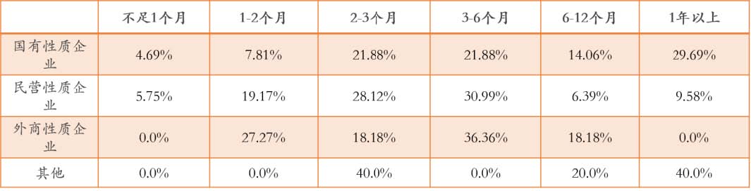 ? ? ??對于超過90%以上的國有文化企業說來資金維持時間超過2個月,且能維持一年以上的占比,與達到29.69%。相對來說,民營性質文化企業及外商性質文化企業面臨資金壓力較大,有近85%民營性質文化企業和近80%外商性質文化企業資金預計支撐不到半年。
